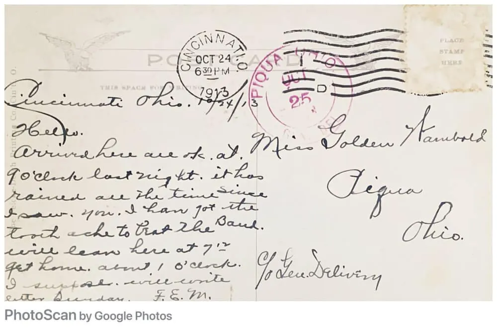 Postmark August 8, 1905 Cincinnati, and August 8, 1905 Milford. To "Miss Rachel Kain (sp?), Milford, Ohio Box 303"
